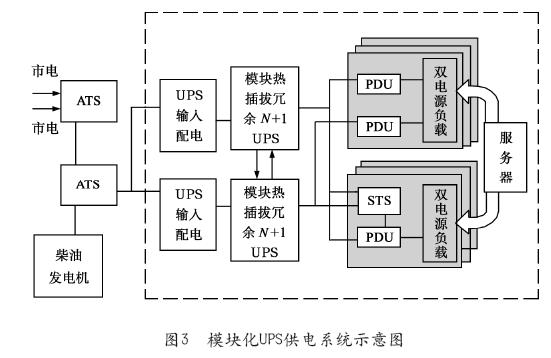 該方案采用模塊化UPS組成“1+1”雙總線供電係統,解決單點故障瓶頸,一般單機容量在200~480kVA比較合適。供電方案如圖3所示。